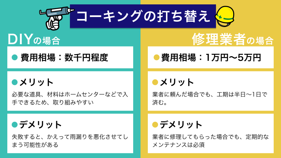 | コーキングの打ち替え | 数千円~5万円程度 | 半日~1日 | 費用が安い、工期が短い | 耐久性が低い |