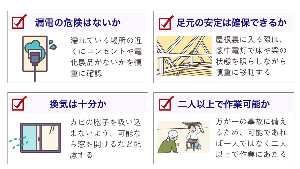 具体的な安全確認としては、まず、濡れている場所の近くにコンセントや電化製品がないかを慎重に確認してください。もしあれば、感電防止のため、電源プラグを抜くか、該当する箇所のブレーカーを落とすことが重要です。屋根裏に入る際は、足元が不安定な場合も多いため、懐中電灯で床や梁の状態を照らしながら慎重に移動し、可能であれば一人ではなく二人以上で作業にあたることをお勧めします。