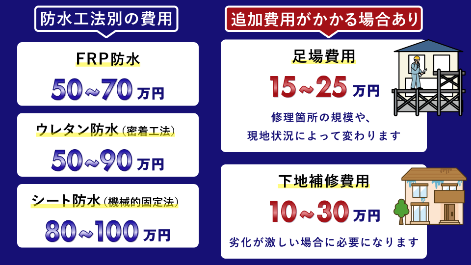 - 工法の選択: 費用が比較的抑えられるウレタン防水なら20万円程度、耐久性の高いシート防水なら50万円程度になることがあります。