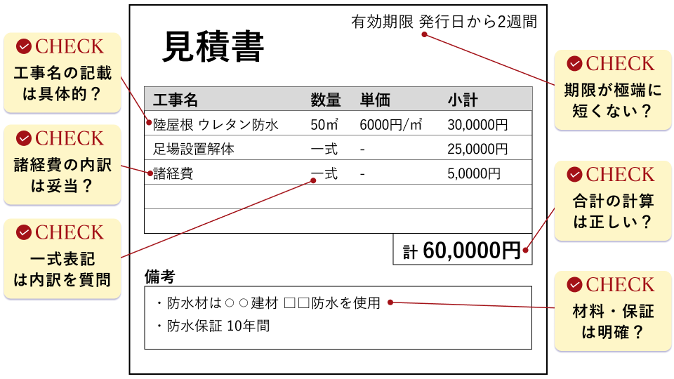 見積もりでは、工事内容の詳細や単価、数量などをしっかり確認しましょう。