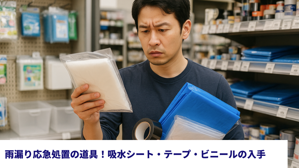 - バケツ、雑巾、吸水シート、防水テープ、ブルーシートなど応急処置に必要な道具リストと、それらを即日入手できる場所(ホームセンター、100円ショップ、オンラインストアなど)