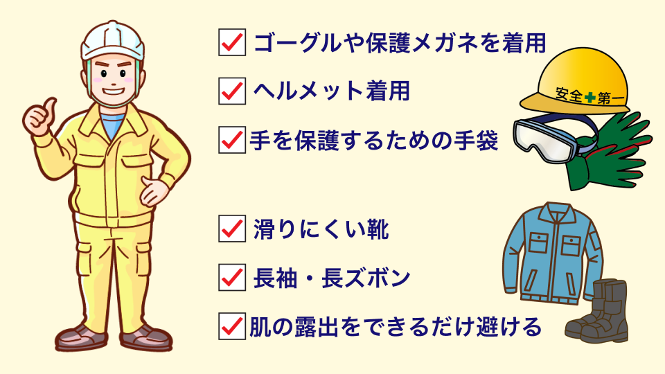 - 服装と装備: 長袖長ズボン、滑りにくい靴、ヘルメットや帽子、保護メガネ、マスク、軍手を着用する。