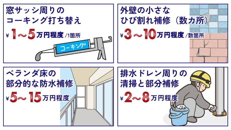 | 部分的な修理費用 | 数万円~30万円程度 | 窓サッシ周りのコーキング、ベランダの小規模なひび割れ補修など。 |