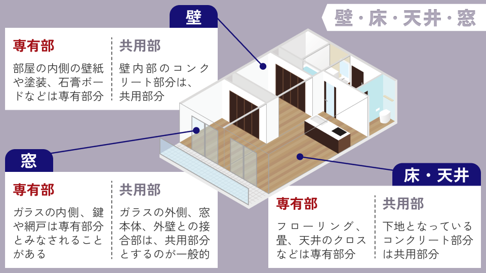 - 専有部分の具体例: 壁紙や天井の仕上げ材、床材など、お部屋の内側の部分を指すことが一般的です。