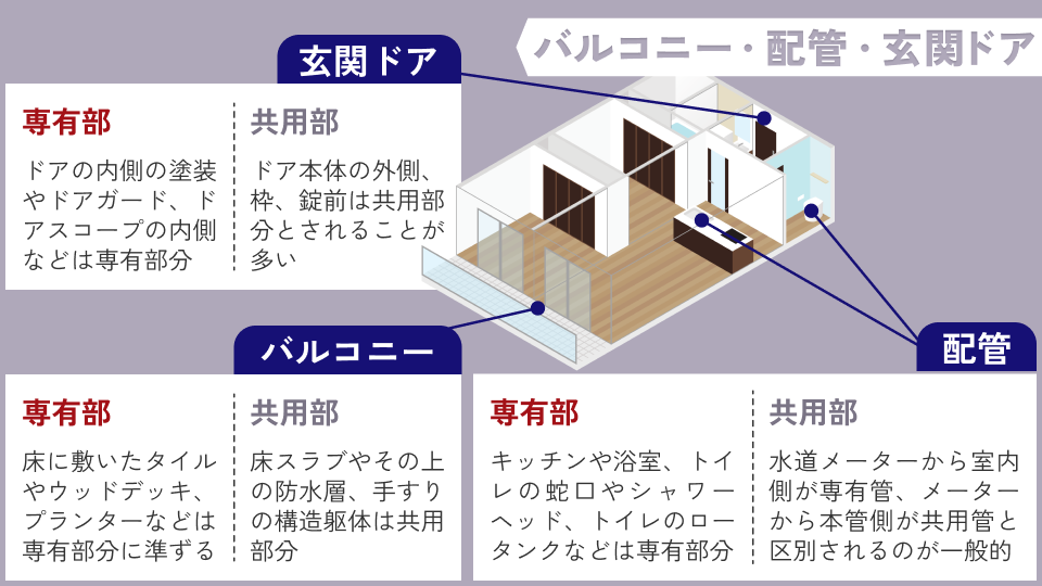 - 共用部分の具体例: 屋根、外壁、廊下、階段、バルコニーの床スラブ(コンクリート部分)や手すりなどが該当します。